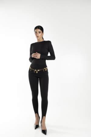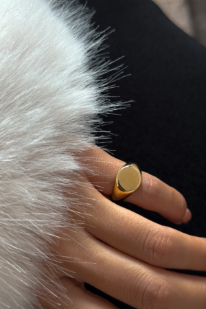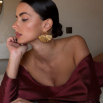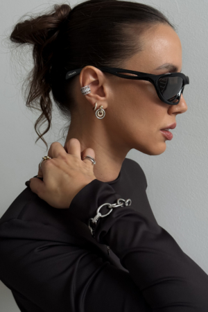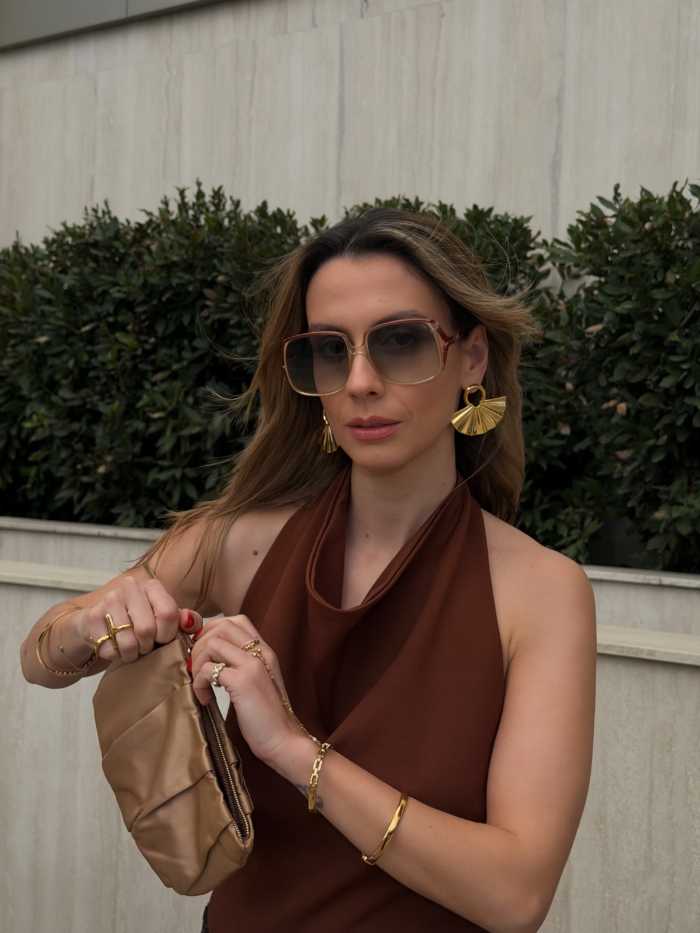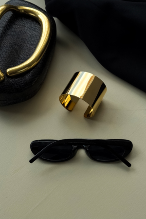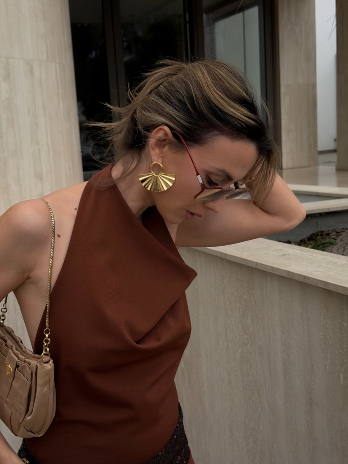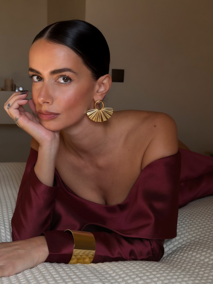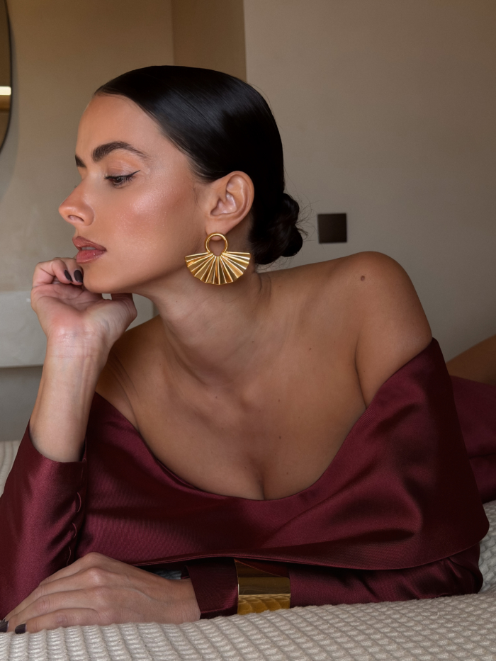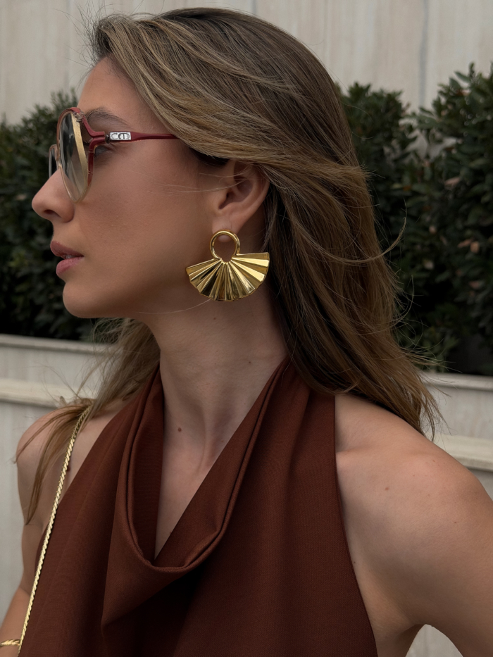A circular gold top holding a pleated fan that opens wide under the ear. Structured lines, glossy finish, bold proportion. They frame the face immediately and shift the whole mood of the look.