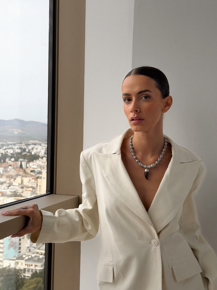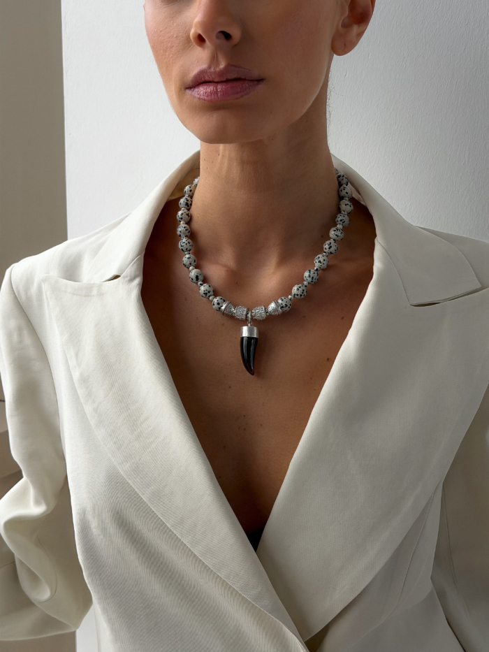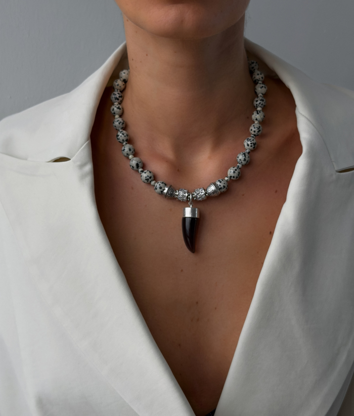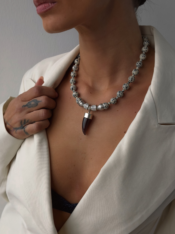 A grounded piece with quiet strength. Jasper stones bring natural texture and depth, each bead unique, each one placed with intention. Finished with stainless steel details and a sculptural horn pendant that sits clean on the collarbone. Strong without noise. Skin-safe, durable, and designed to be worn close, all day.