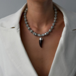 Works best with an open shirt, a sharp blazer straight on skin, or a simple tee. Let it sit solo and do the work.