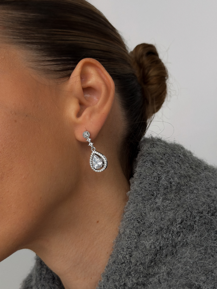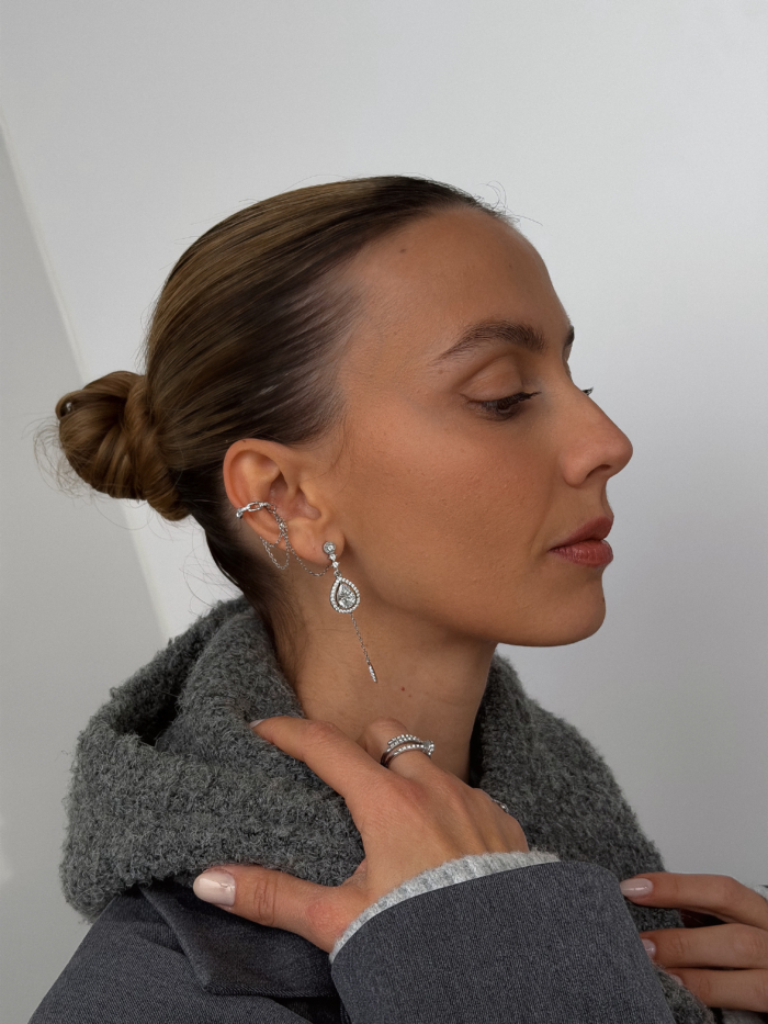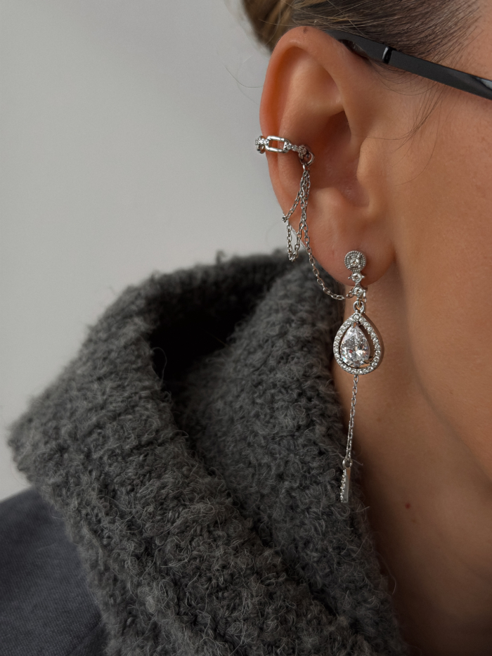 Starts clean with a classic drop earring and shifts the moment you add the connecting earcuff.