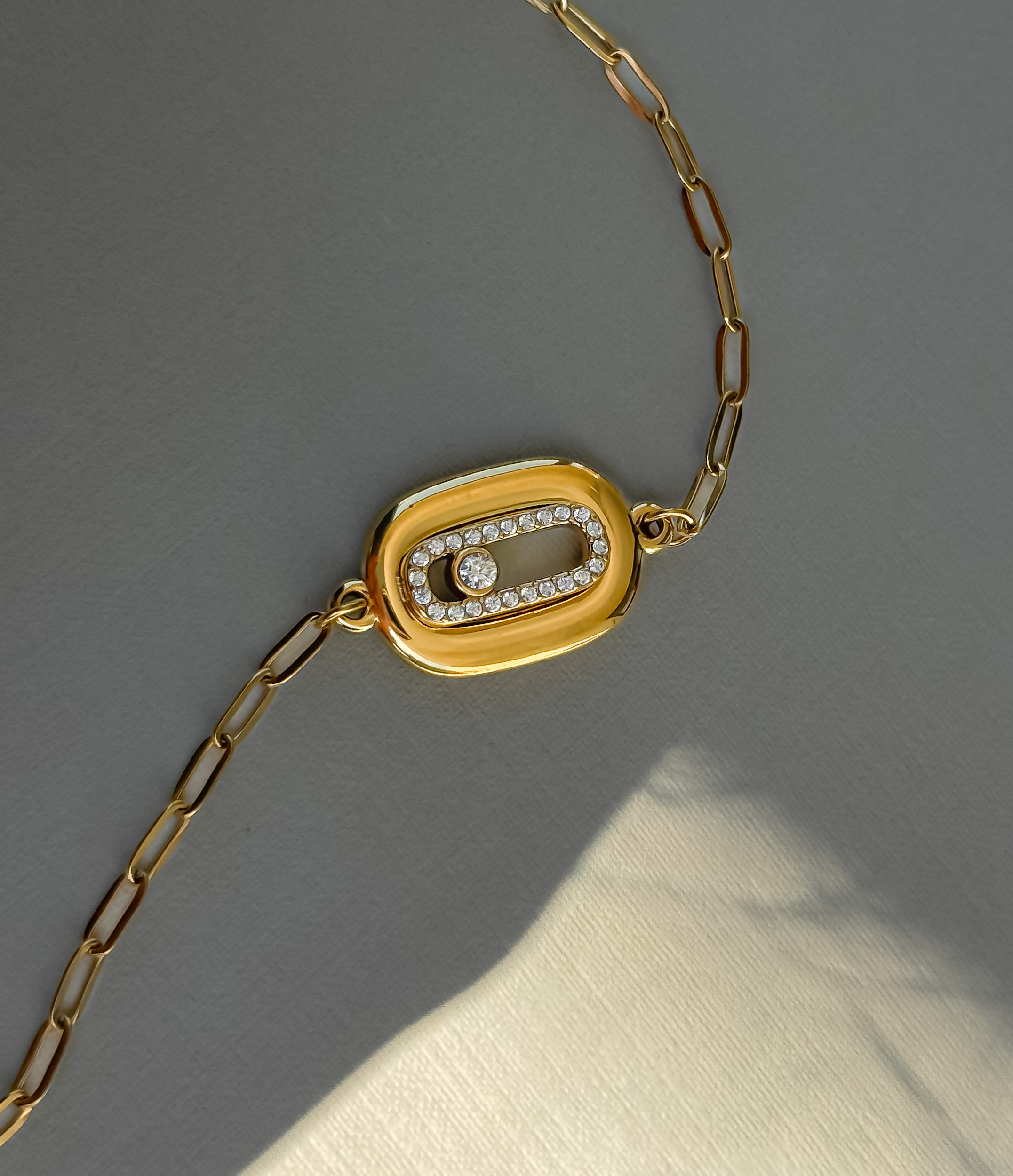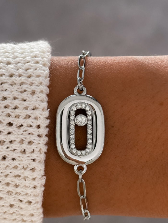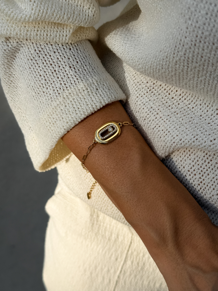 Playful geometry wrapped in gold. The bold link plate is framed with pavé crystals that catch the light like it is part of the game. Strong, modern, and instantly iconic, the bracelet that refuses to be background.