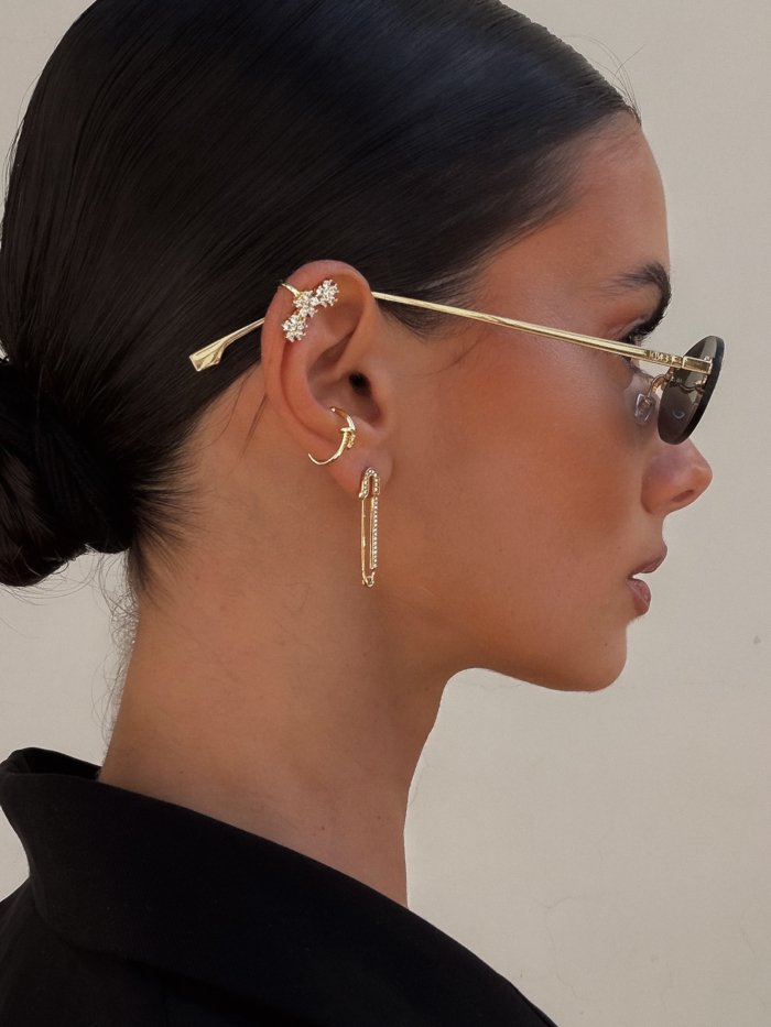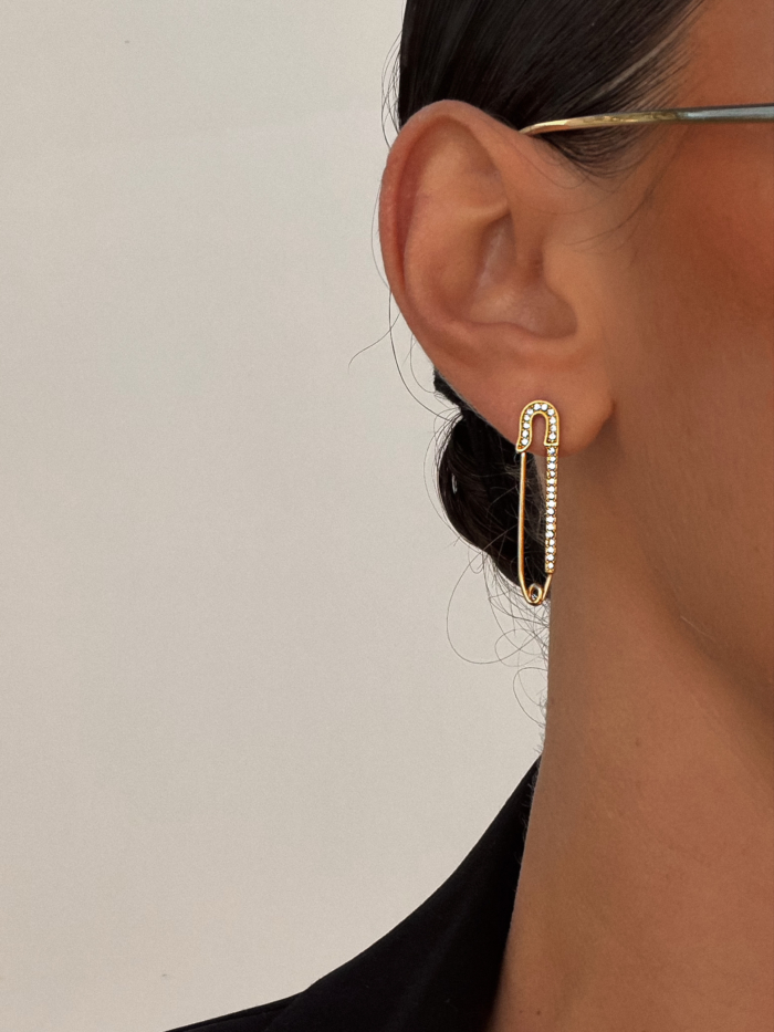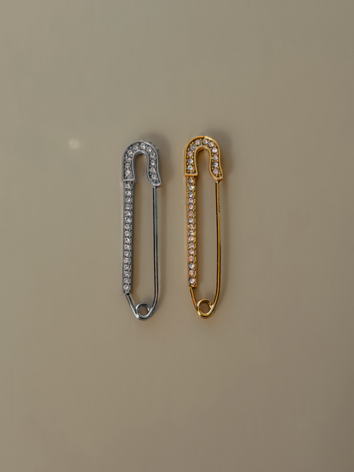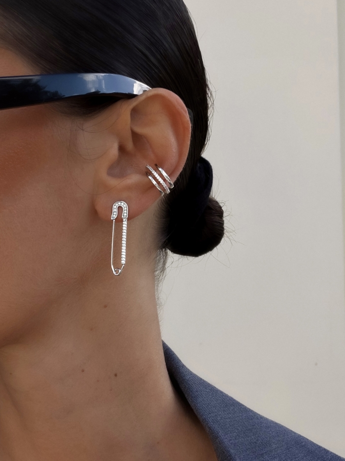 A polished safety-pin silhouette in stainless steel, traced with fine zirconias. Clean, graphic, slightly rebellious. Worn solo it feels precise. Styled with earcuffs it shifts into something more architectural, more deliberate.