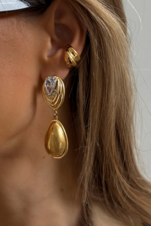 Stainless steel in warm gold tone, shaped into a sharp, sculptural drop with a clear stone sitting right at the centre. Clean lines, full shine, and a silhouette that feels both classic and slightly unhinged in the best way.