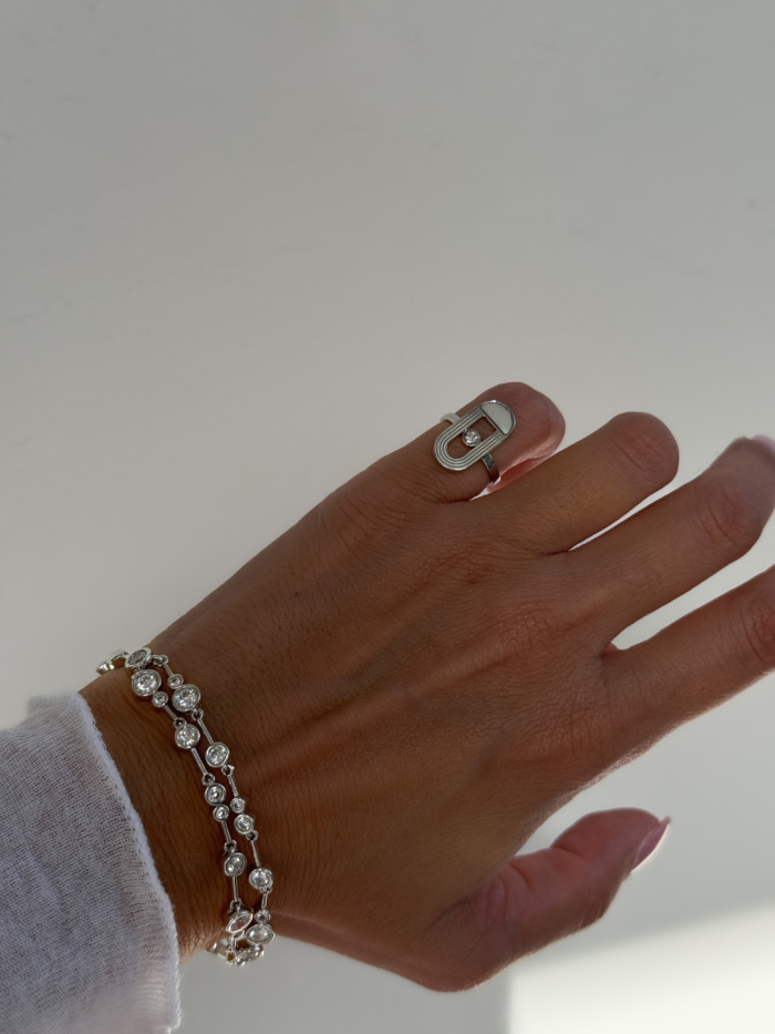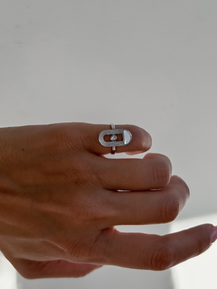 A pinky ring with attitude. Built in silver-tone stainless steel, structured with smooth lines and a single zirconia in the center. Minimal but loud enough if you know how to wear it.