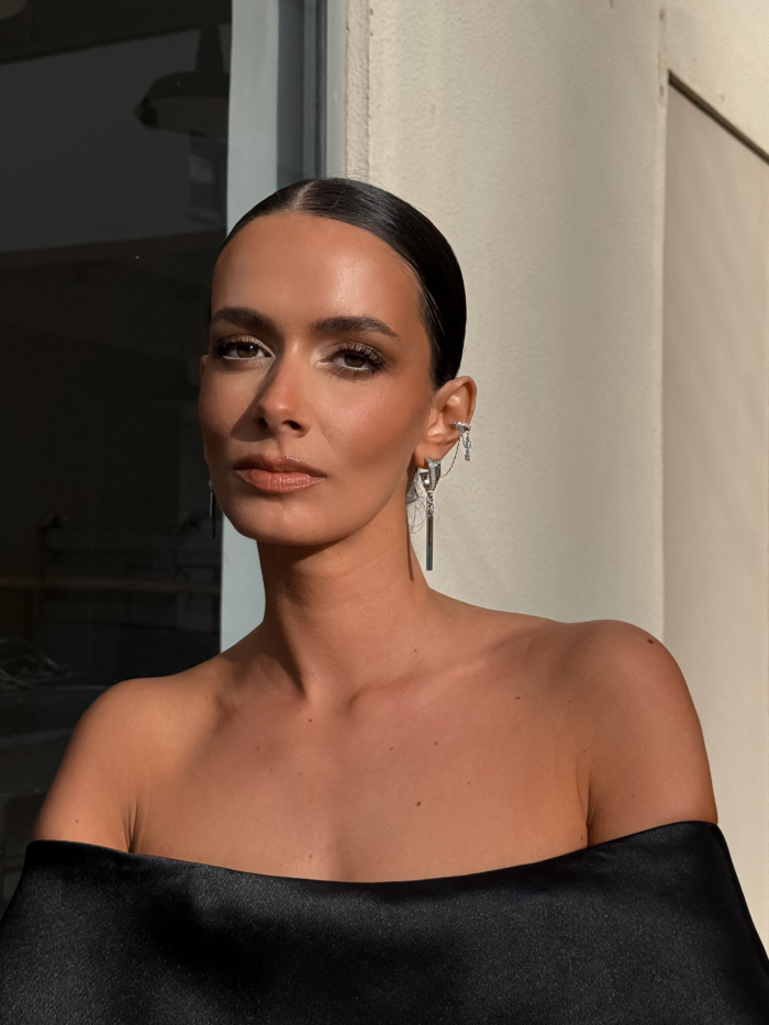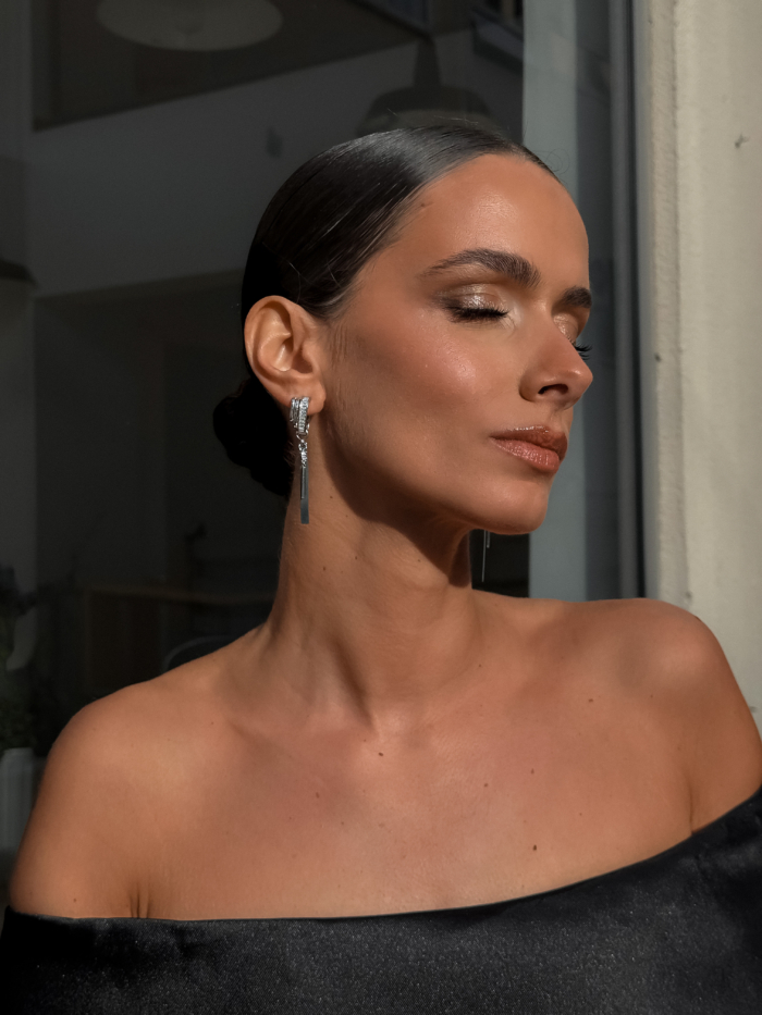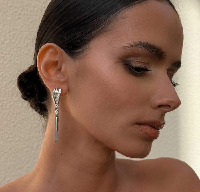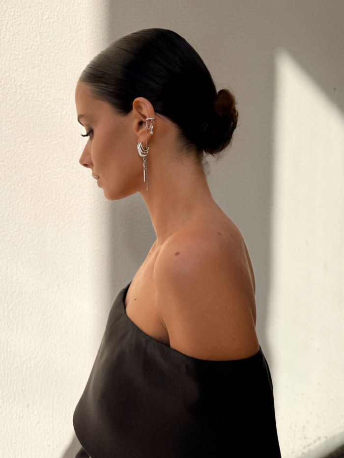 A silver-tone stainless steel earring with high-quality zirconia details and a detachable earcuff that slips on and off depending on your mood. Structured at the lobe, fluid through the chain, finished with a slim drop that moves softly with you. Wear it complete when you want intensity, or remove the earcuff when the look calls for restraint. One piece, multiple versions of you.