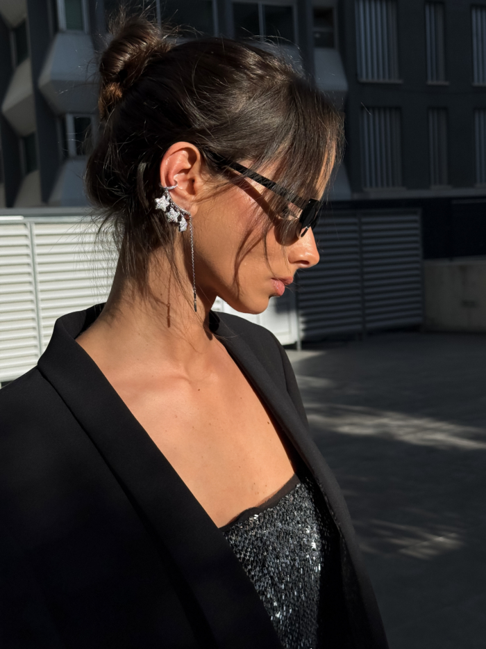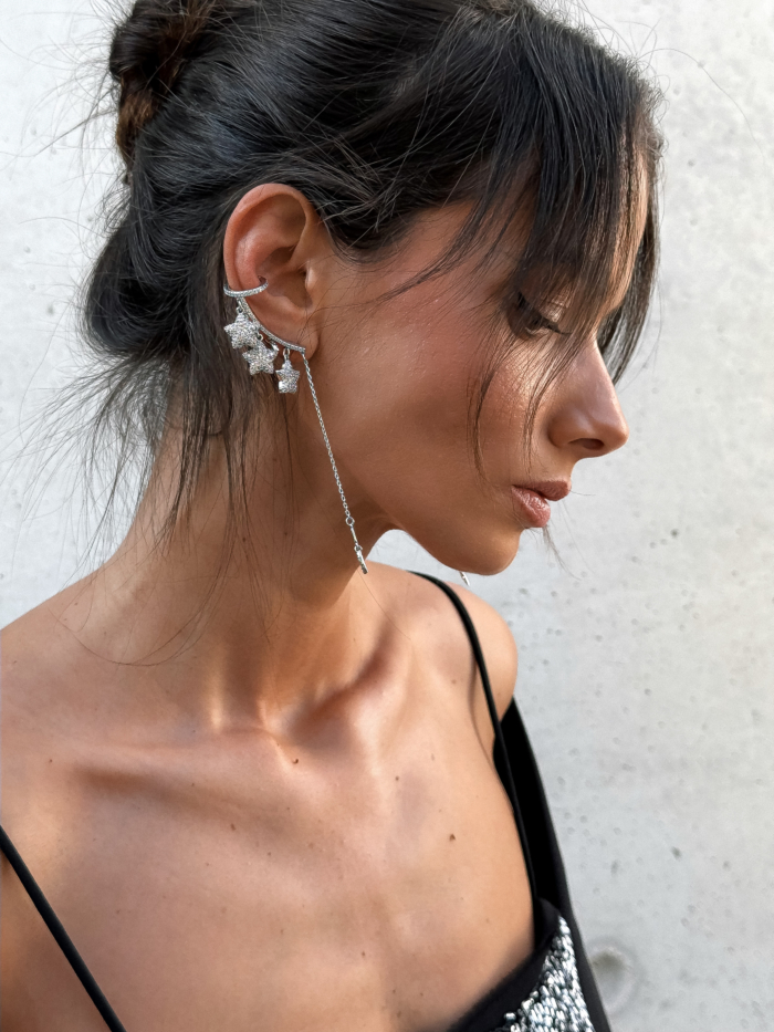Curved lines hug the ear, creating the illusion of a stacked, intentional setup without committing to extra holes.