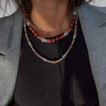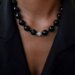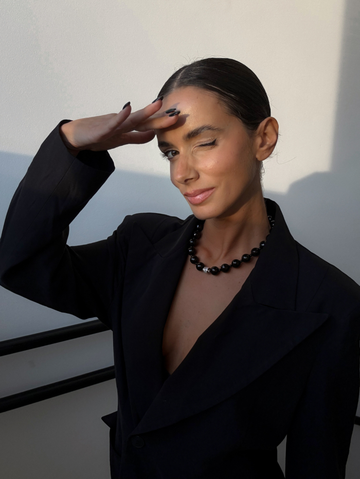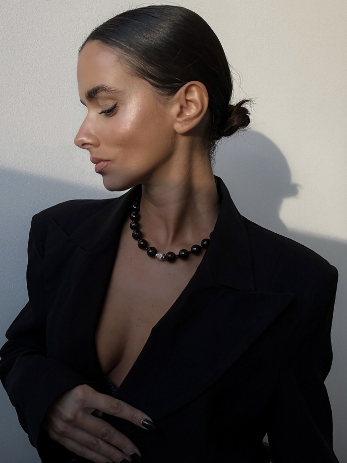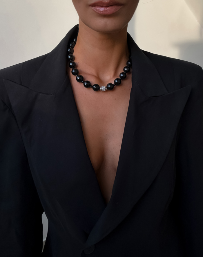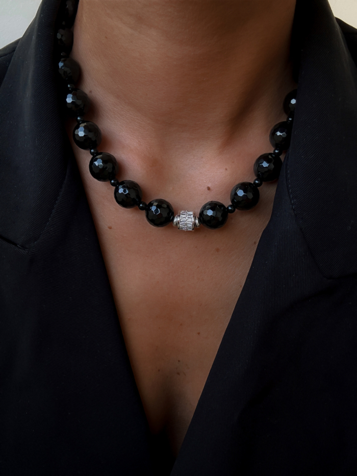 Stainless-steel core wrapped in deep onyx beads, glossy, grounded, impossible to ignore.