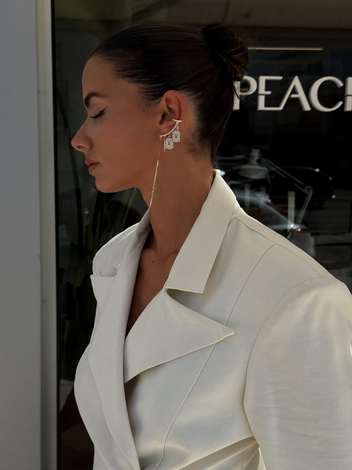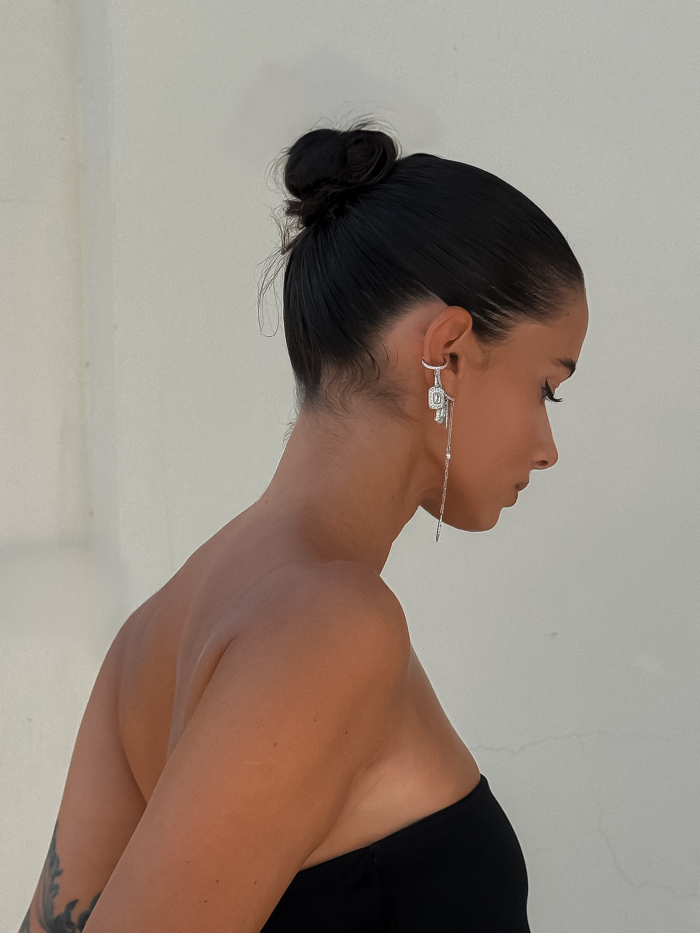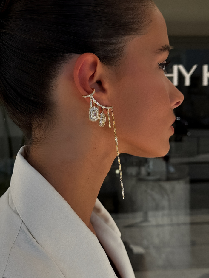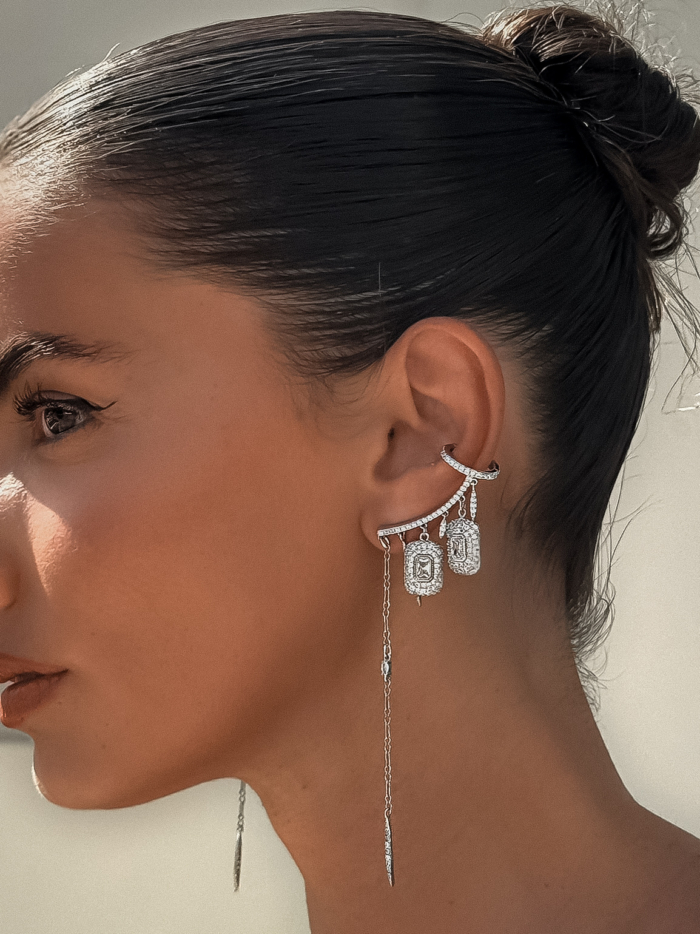 Illusions of many piercings built into one design. Hundreds of zirconias catch the light, the structure climbs and drapes with precision. A signature piece, available in silver or gold, crafted to decorate the ear like no other.