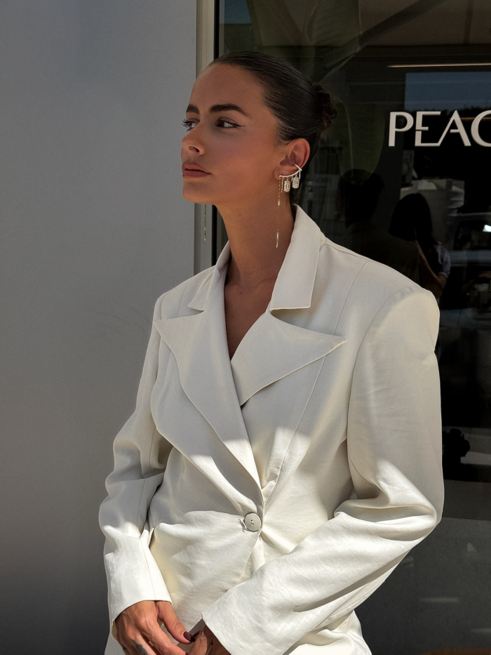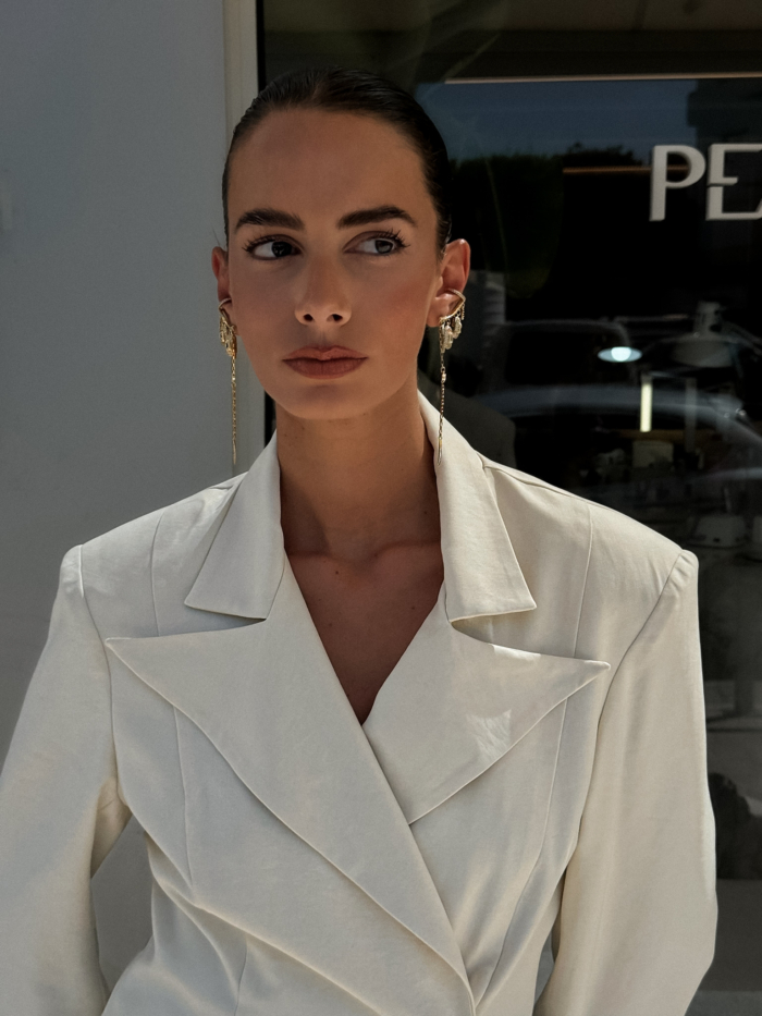 Split the look. Go all in on one ear, let the other breathe with just a stud, a hoop, or something minimal. Mismatching is the game, especially when one side is this dressed up.