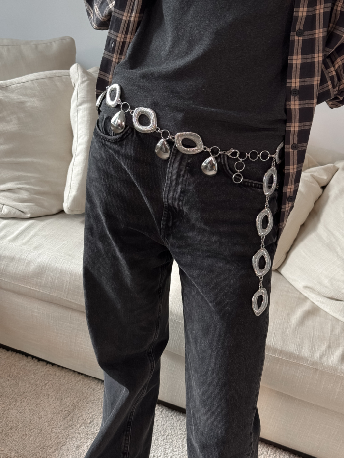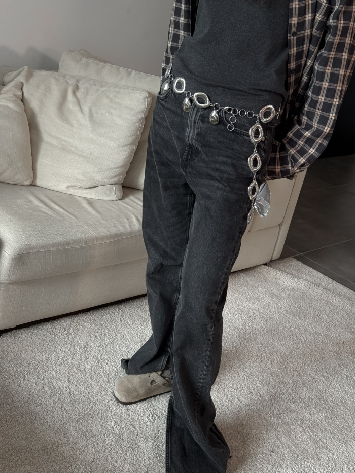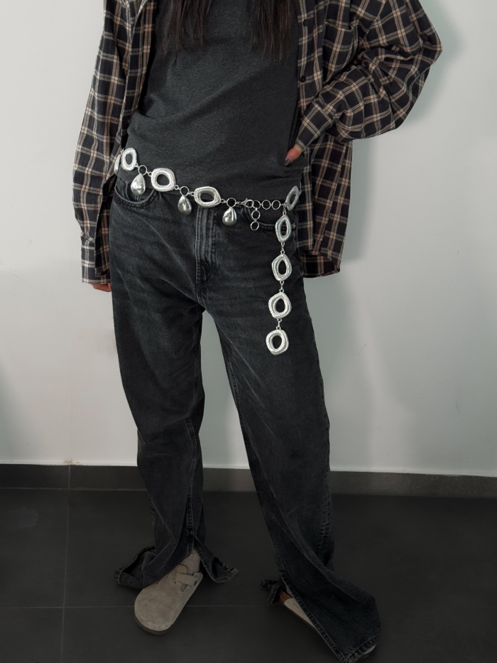A belt built around weight, movement, and repetition. Made of stainless steel with textured oval elements and polished drops that sit with intention rather than decoration. It wears clean on the waist or lower on the hips, shifting the look without trying too hard. Adjustable with an extension chain for flexible sizing and placement. Part of a super limited run, released one by one and designed to feel personal the moment it lands on you.