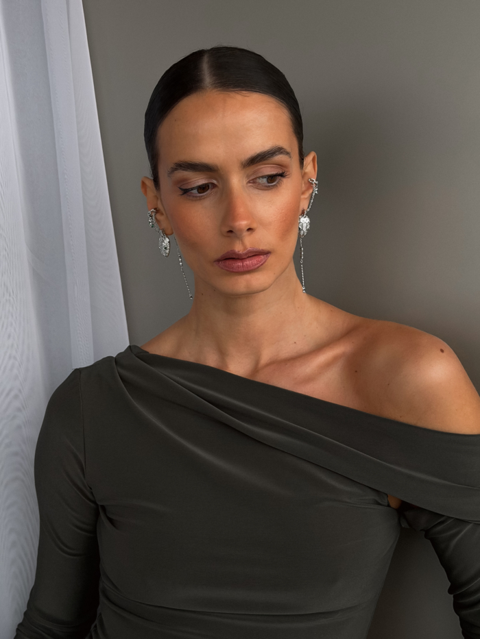 Start simple with a clean top or dress. Add the connecting earcuffs when you want the look to feel stronger, styled, and unexpected.