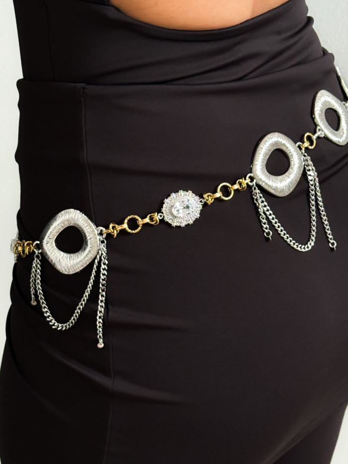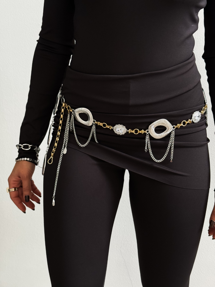 A belt built for presence. Stainless-steel shapes, textured ovals, and falling chains that shift the whole silhouette the moment they touch the body. It sits on the hips or climbs to the waist, changing mood depending on how you place it. Fully adjustable, created in limited numbers, designed for that quiet surge you feel when something transforms your look without trying.