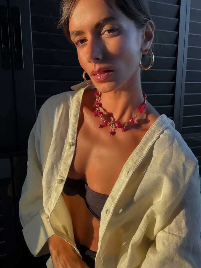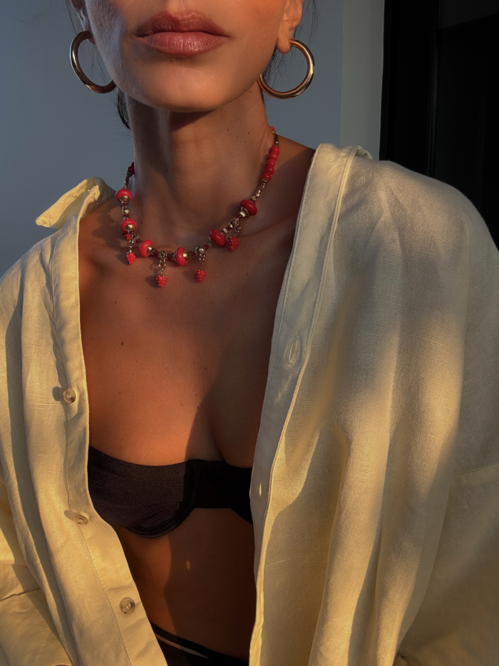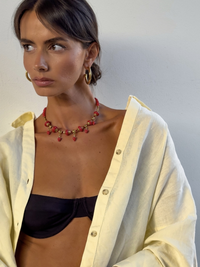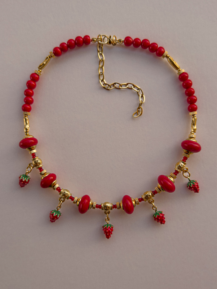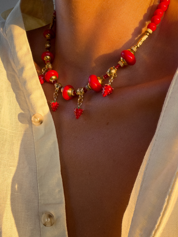 Sun drenched and sweet, with that touch of mischief only strawberries know. Mara is strung with shiny red beads, juicy strawberry charms and warm golden details, like a fruit stall in Sicilia at golden hour. Skin-safe. Adjustable fit & water resistant.