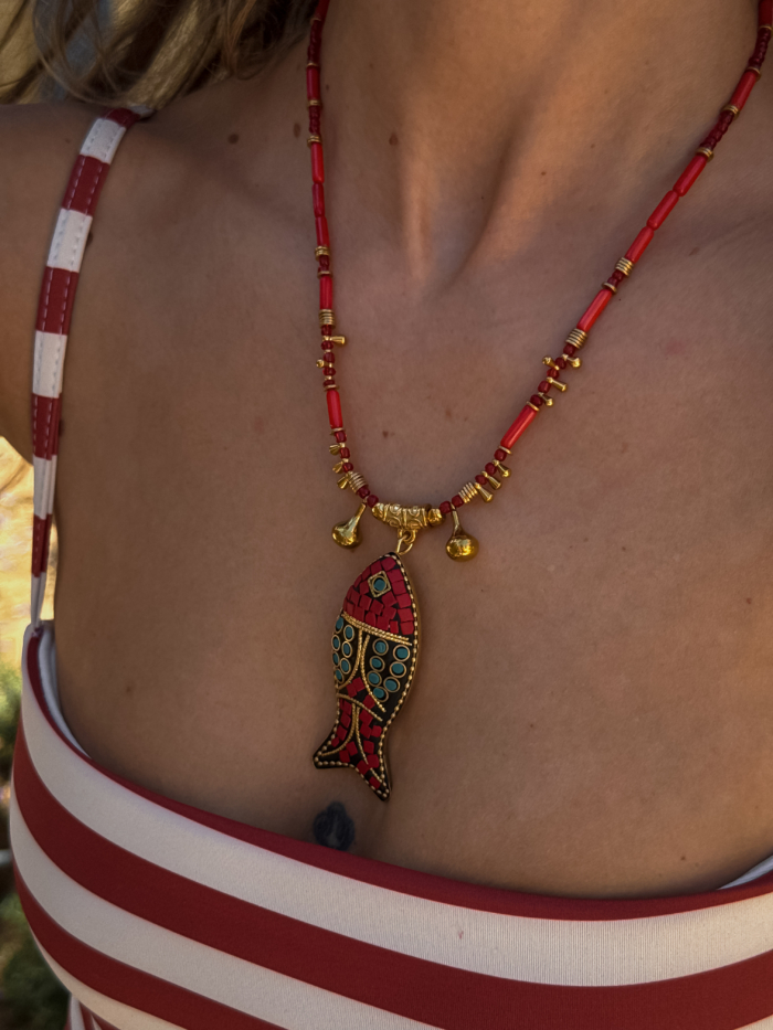 Mosaic fish in deep red, with gold bells and coral tones that feel sun drenched.