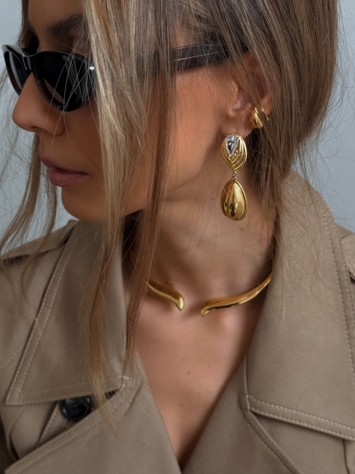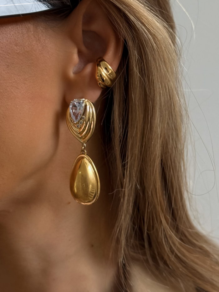 A drop that feels vintage in the best way. Sculpted gold, a soft pear curve, and a clear stone sitting right above it like it knows its place. It moves with you, it catches light without trying.