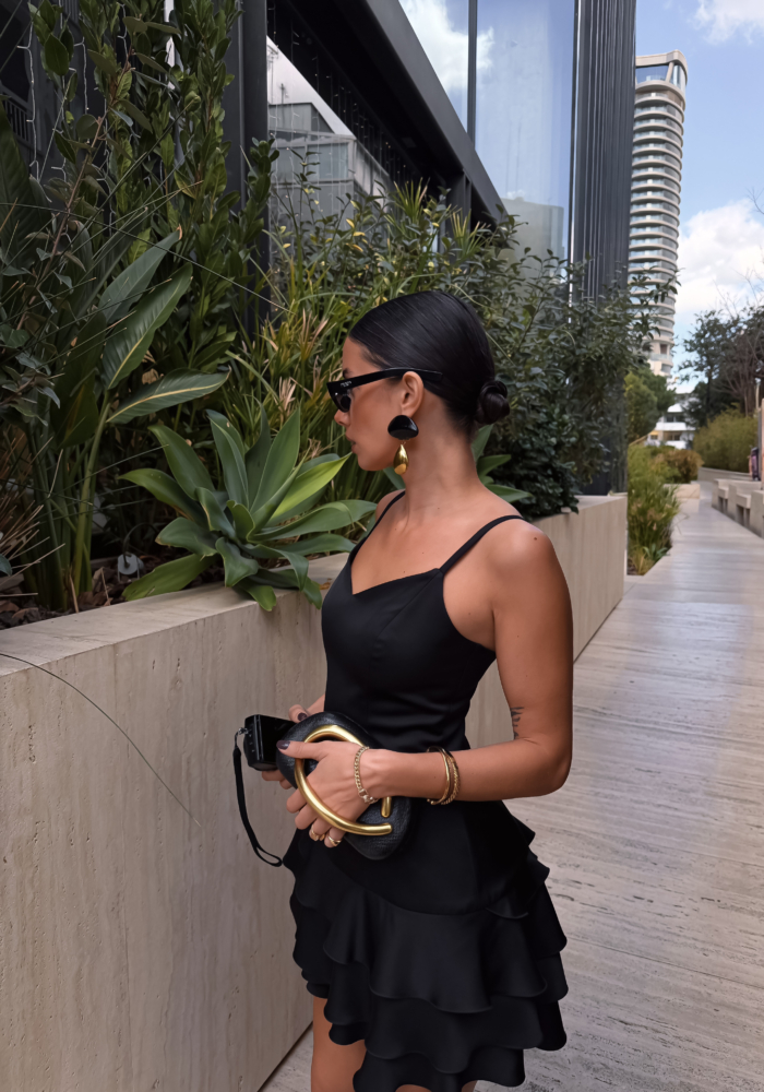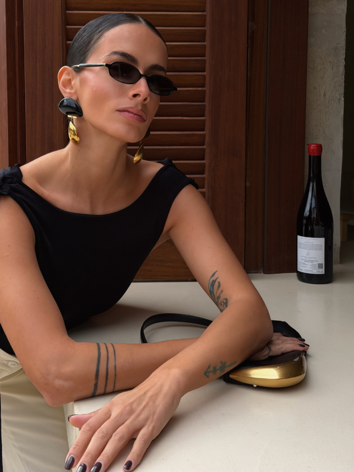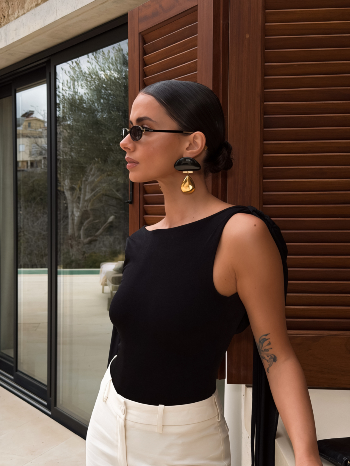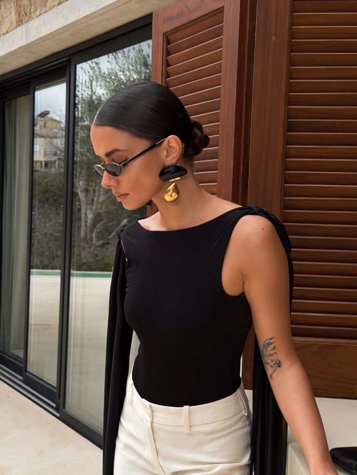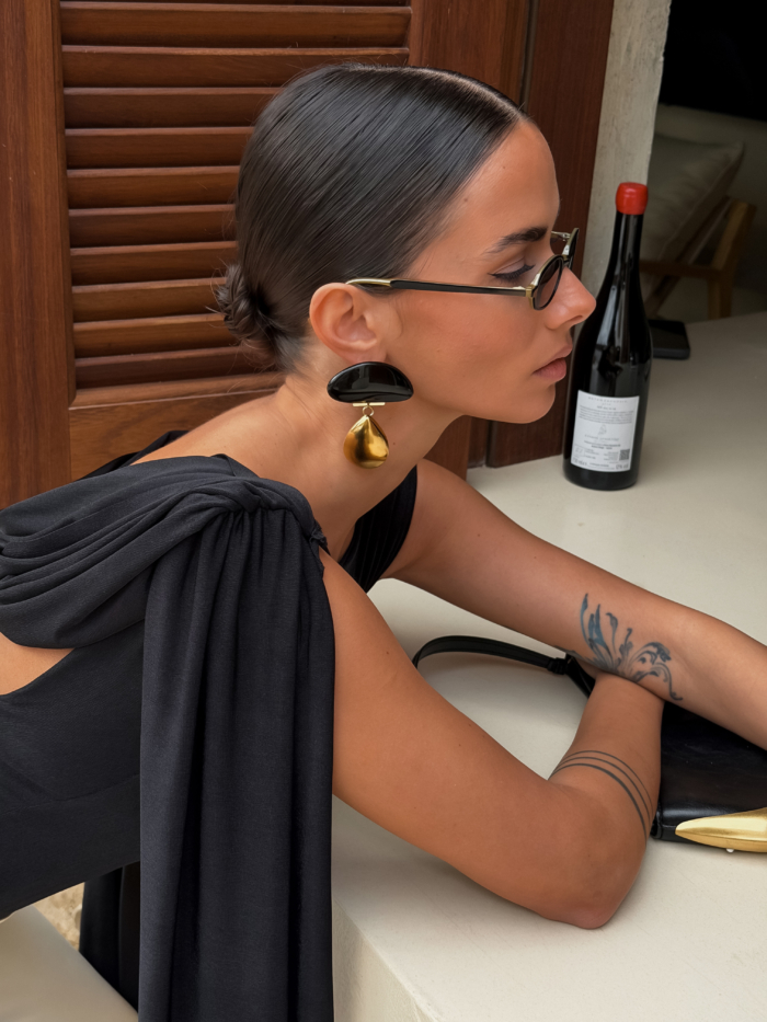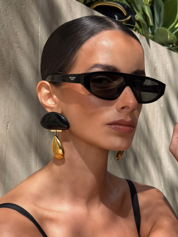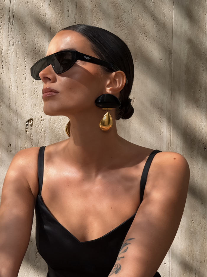 A sculptural balance that frames the face with precision. The contrast feels sharp. The finish feels rich. The movement of the gold catches light with every turn of the head.