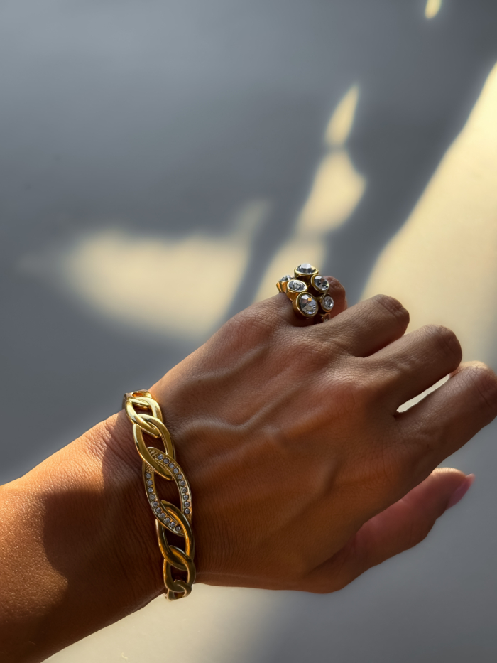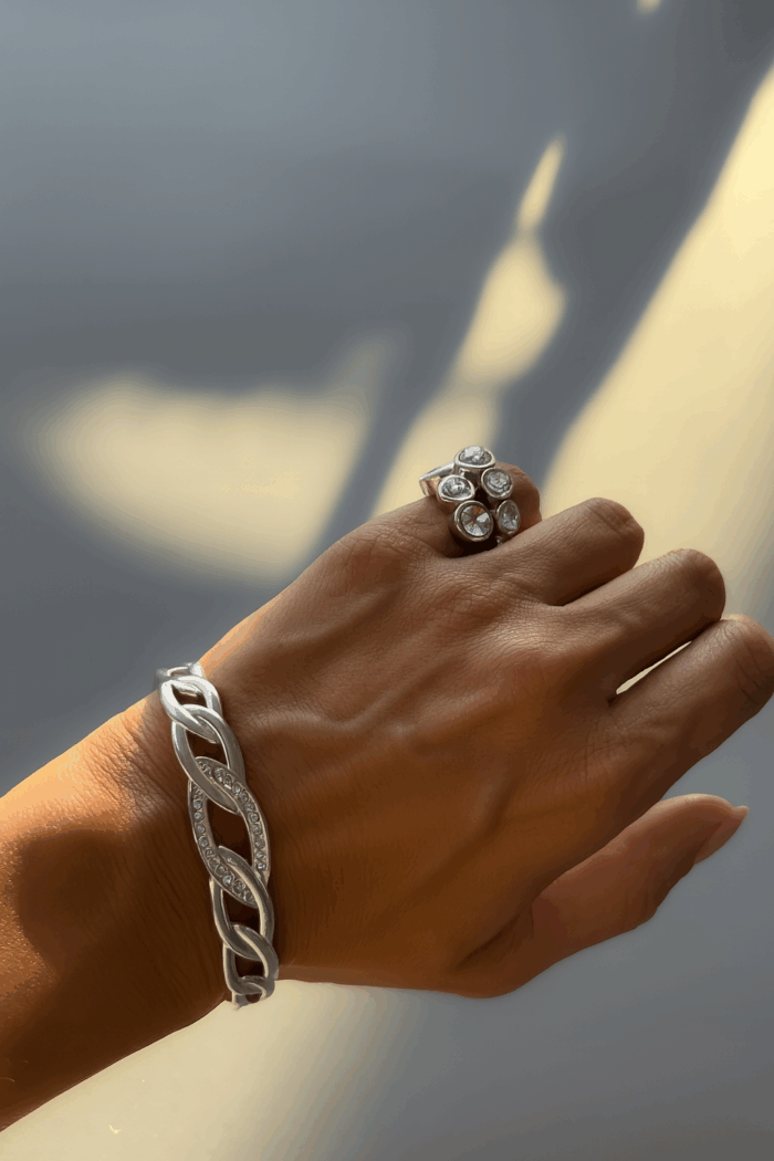Stainless steel. Zirconias. Skin-safe. Comes in both tones. Adjustable fit.