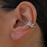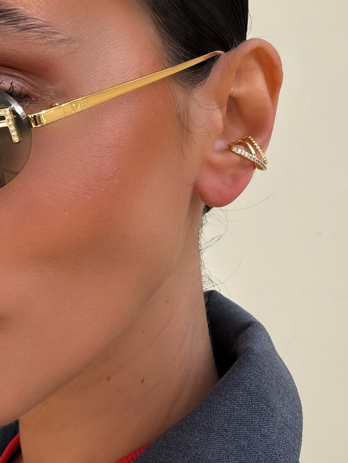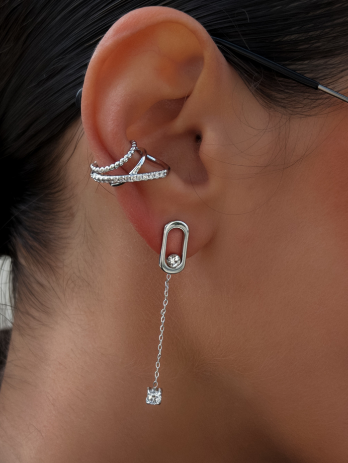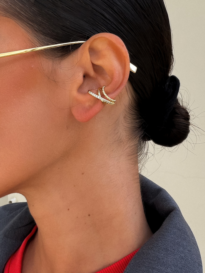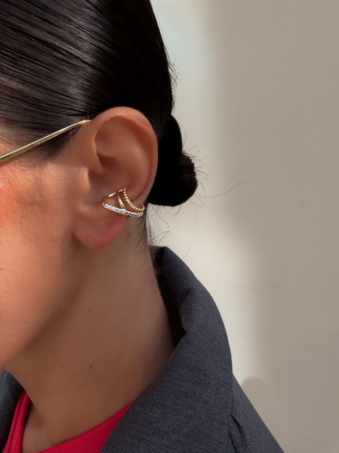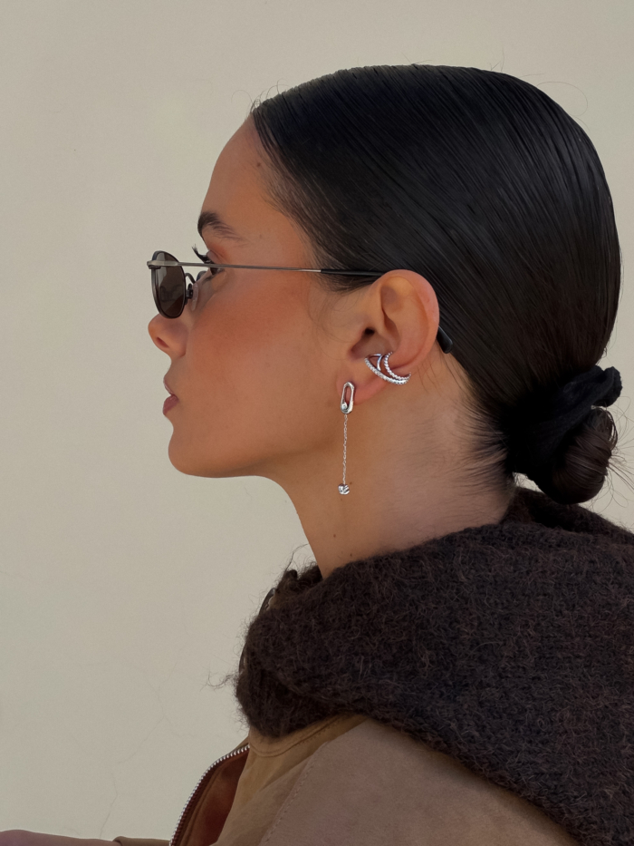A double-layered stainless steel earcuff designed with clean curves and a fine zirconia line for subtle texture. Sculptural but balanced. It hugs the ear naturally and adds depth without weight.