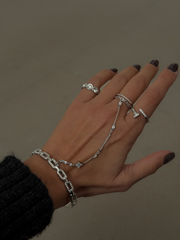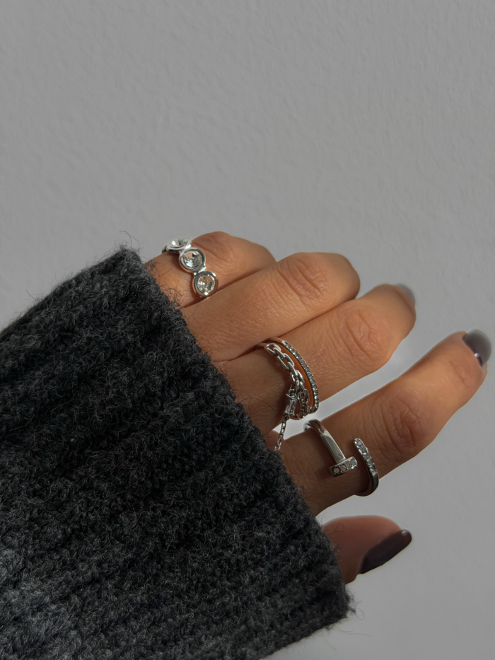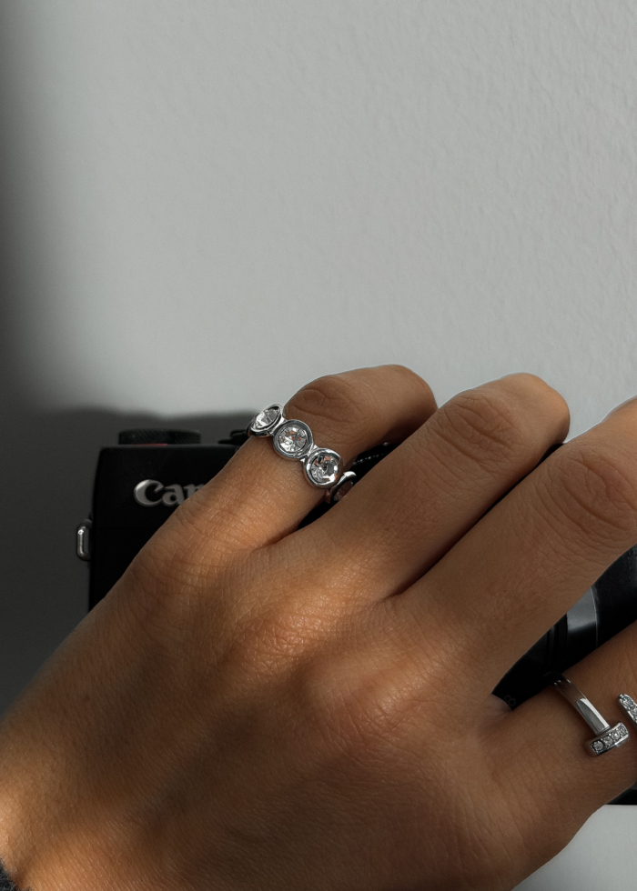 Three stones aligned in a row, set in polished stainless steel. Clear zirconia that catch the light in a quiet, precise way. Clean lines, sharp presence, no excess. Adjustable fit so it moves with you and sits exactly where you want it. Skin-safe, designed for everyday wear, strong enough to stay, subtle enough to repeat.