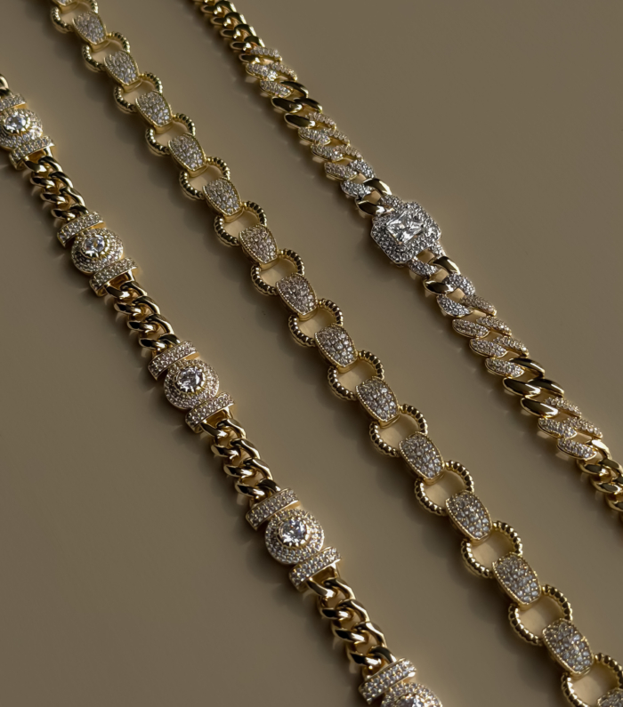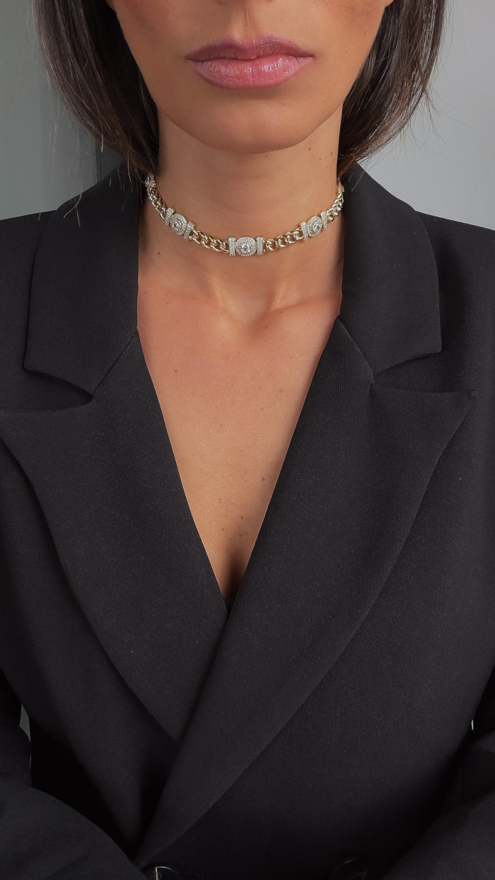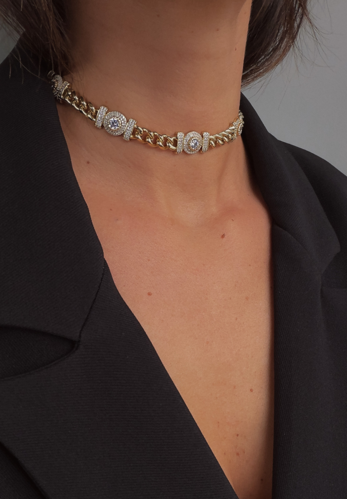 A tight gold choker built with oval links and zirconia-set details that catch the light every time you turn your head. Structured, close to the neck, strong presence without shouting. Two fixed sizes so it sits exactly where it should. Clean. Polished. Slightly dangerous.