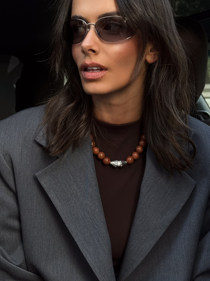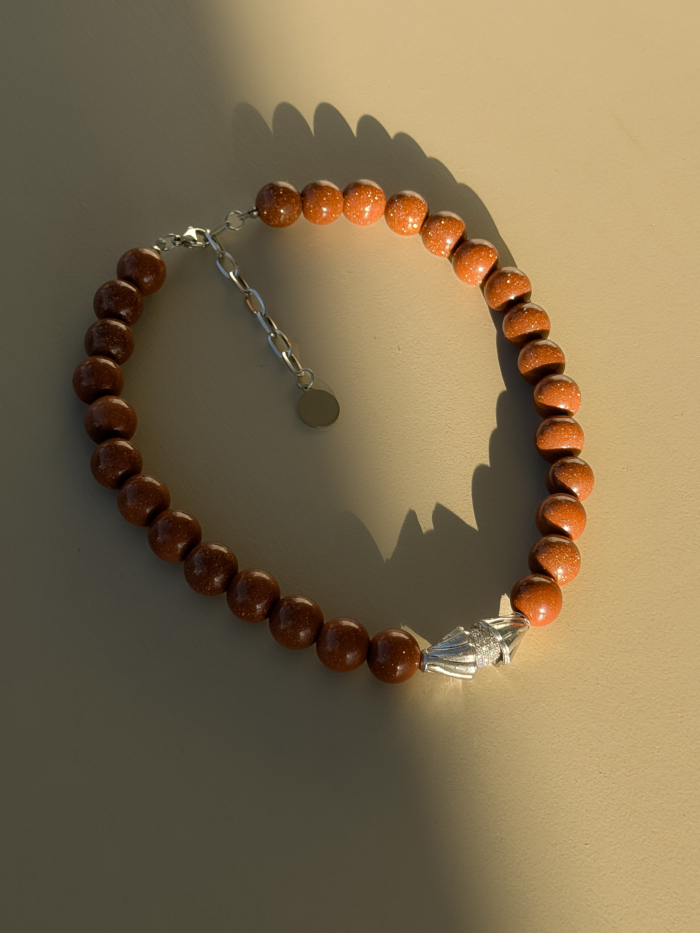 Semi-precious goldstone beads with a warm, copper glow that catches the light without trying too hard. Each bead has depth, movement, and that subtle shimmer that feels intentional, not decorative. Finished with a silver-tone stainless steel detail that grounds the shine and keeps it sharp.