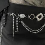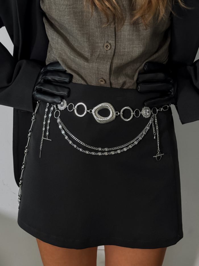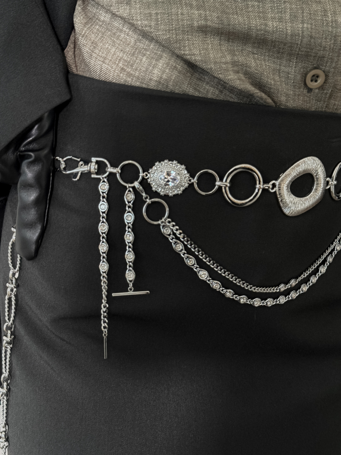 A belt built to shift the whole mood the moment it wraps around you. Stainless-steel links, cut-outs, and hanging chains that move with the body, giving that raw, sculpted edge. Fully adjustable, with a lower chain section that connects with a clasp so it sits perfectly on trousers as well as skirts. A limited addition to the collection, created to feel like something discovered rather than designed, quietly striking, instantly yours.